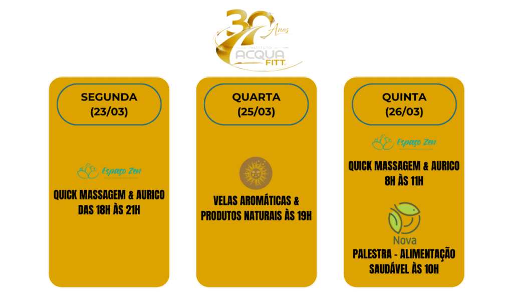 Além de nossas aulas especiaias, teremos experiências exclusivas ao longo da semana com três parcerias incríveis! O Espaço Zen vai disponibilizar sessões de quick massage e auriculoterapia. A Lúmia vai trazer suas velas aromáticas e seus produtos naturais dentro da nossa aula de Yoga. E a Nova Alimentação Saudável em parceria com nossa nutricionista Loren, vão bater um papo sobre alimentação saudável na prática no nosso dia a dia.